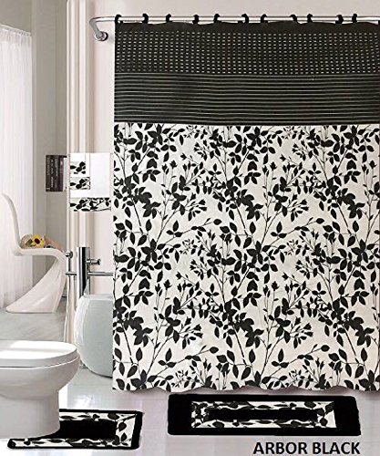 18 Piece Bath Rug Set Black White Beige Leaf print bathroom rugs shower curtain/rings and Towels sets-Arbor Black