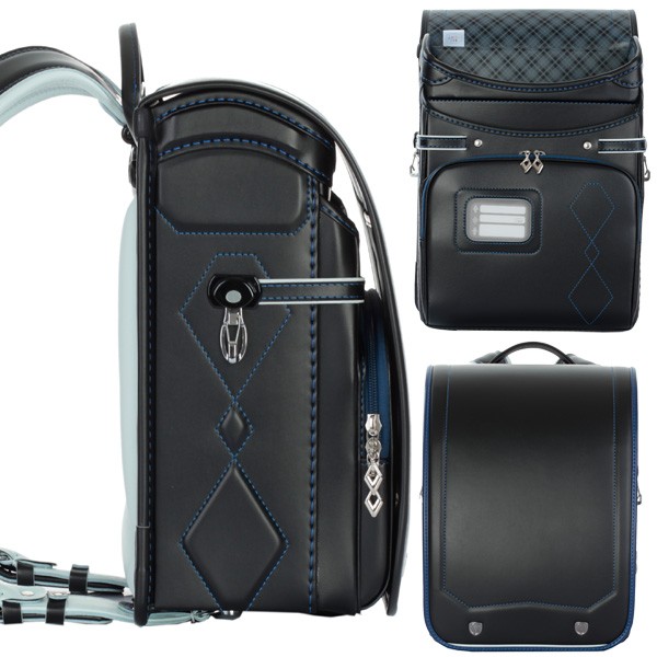 内装:グレーチェック、錠前:ワンタッチロック、補強:ガッチリガード、ポケット:ワイドポケット・Dカン付、肩ベルト:ふわりぃ仕様・長尺・9穴・右(Dカン)・左(Dカン)、鋲:エンブレム、ナスカン:反射材付、冠裏:グレーチェック、反射材:冠下部・前締め・肩ベルト、固定型持ち手、カラー:ブラック×ロイヤルブルー