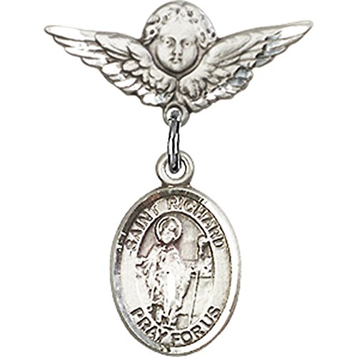 -. Title : Sterling Silver Baby Badge with St. Richard Charm and Angel w/Wings Badge Pin 7/8 X 3/4 inches