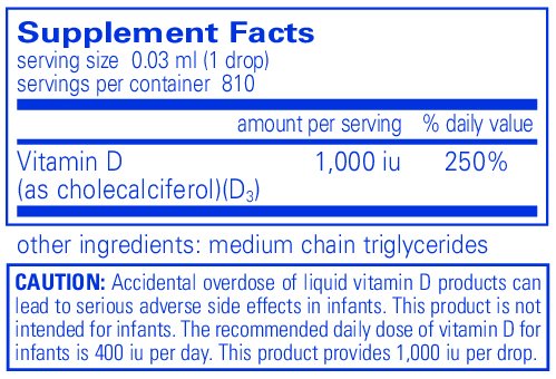 Pure Encapsulations vitamin D3 liquid provides 1,000 I.U. per drop, an ideal daily amount. For individuals with greater short-term needs, this product allows for achieving 25,000-50,000 I.U. vitamin D3 per week without having to take multiple capsules.