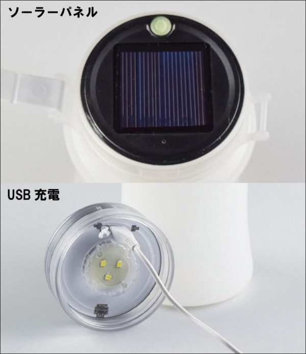 USB充電、ソーラー充電の2通りの充電でとても便利です。防水加工で持ち手付き。柔らかい素材を使用しているので、使わない時はコンパクトにたためます。 |
