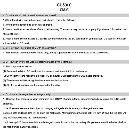 -. Feature : SPY GLASSES: This is a 8GB 1920x1080P HD Spy Eyewear Glasses,with mini hidden camera built-in ,Support Audio Recording. There's nothing more to buy - Purchase today and feel like a secret agent tomorrow! / 8GB MEMORY: This Spy Sun Glasses camera has 8GB Micro SD card built in,so you can use without any interruptions.(Support 32GB TF Card in Max). / VIDEO AUDIO GLASSES: Real-time Video Recording,Video Resolution: 1920x1080P ,Video Format: AVI ,Video Compression Format:M-JPEG ,Video Frame Rate:25/30fps;Save a video file every 3 minutes. A: This camera could not make audio only, it only support make video and audio at the same time. / HIGH DEFINITION: This Spy camera produces 1920x1080P Full HD video so recorded events are always crystal-clear / PACKAGE INCLUDES: 1x 8GB 1920x1080P HD Spy Eyewear Glasses,1x USB Cable,1x User Menu,1x Power Charger