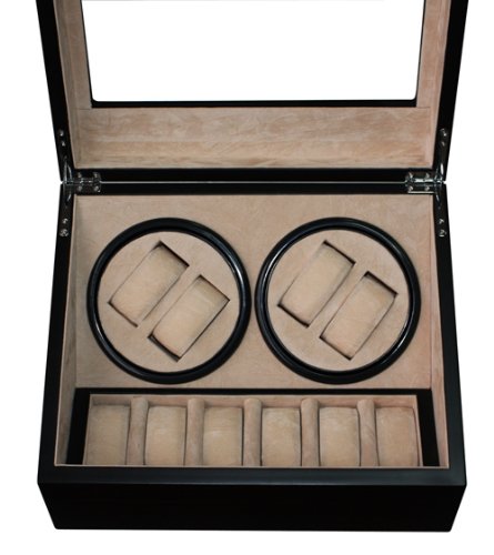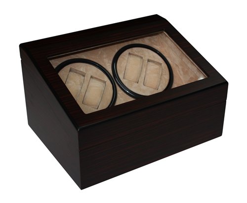 -. Binding : Watch -. Brand : TimelyBuys -. Department : unisex-adult -. EAN : 0816881013202 -. Feature : Tastefully winds four watches, while offering convenient storage for an additional six watches / Case measures 9 1/2" x 12" x 7" and individual watch slots measure 30 mm (2 3/4" L x 1 1/4" W); Pillow Size: 2 3/8" L x 1 1/4" W x 1 3/8" H / AC Power adaptor included; operates with 2 AA batteries as an alternative power source / Alternating clockwise and counterclockwise movement; Extremely silent motor / Movement Specifics: Rotates clockwise for 5 minutes, rests for 15; moves counterclockwise for 5 minutes, rests for 15, and repeats -. Label : TimelyBuys -. Manufacturer : TimelyBuys -. Model : 4 + 6 Winder Ebony -. MPN : 4 + 6 Winder Ebony -. PackageQuantity : 1 -. PartNumber : 4 + 6 Winder Ebony -. ProductGroup : Watch -. ProductTypeName : WATCH -. Publisher : TimelyBuys -. Studio : TimelyBuys -. Title : TimelyBuys 4 + 6 Quad Ebony Wood Automatic Watch Winder & Storage Case -. UPC : 816881013202