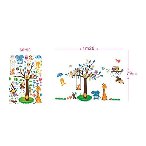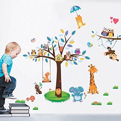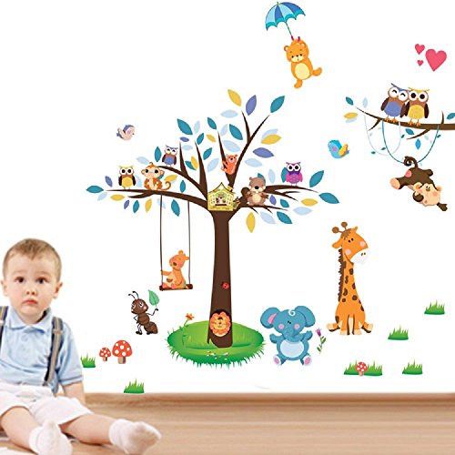 Amaonm® Creaitve Jungle Wildlife Forest Animals Paradise Cartoon Monkey Owls Giraffe Elephant & Giant Bown Tree Wall Decal Wall Stickers Murals for...
