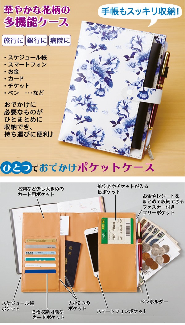 | スケジュール帳もスッキリ収納!華やかな花柄の多機能ケースです。手帳・スマホ・お金・カード・チケットなど、おでかけに必要なものがひとまとめに収納でき、持ち運びに便利♪航空券・パスポートを入れて旅行に、通帳・キャッシュカードを入れて銀行回りに、診察券・おくすり手帳を入れて通院に、用途やお好みに合わせてアレンジ自在です。ポケットケース/マルチケース/多機能ケース/手帳ケース/カードケース/ポーチ/財布/花柄/ |