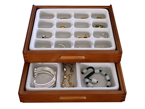 -. Feature : *NEW AND IMPROVED* Hand-crafted from hardwood with beautiful maple finish and clear lacquer coating that preserves the beauty for many years of use. / Customize using multiple organizers by Axis; stackable, sliding design. Different sizes and compartment boxes available and can all be used together in any configuration. The Slide 'em feature allows you to slide the trays to the left or right and see all of your jewelry at the same time. / Soft, velvet-like flocked interior tray prevents scratches and tarnishing which is important for jewelry and ring protection. / Perfect for Rings, cuff links, pins, earrings, bracelets and more / Measures 9-1/8 by 8-1/8 by 1-3/8 inches (LxWxH). 16 compartments to help eliminate tangling of jewelry. Individual compartments are 2"L X 2"W X 1" H. A unique, USA Patented Design Other Axis stack-em compatible with this one are: #2702, #2721 and #2722