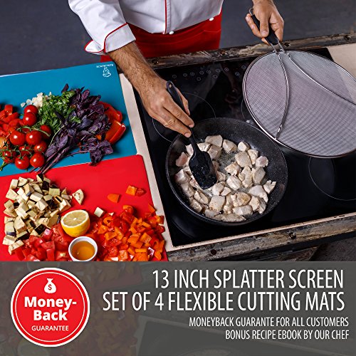Set of best kitchen accessories for a chef or cooking enthusiast: 13-inch heavy-duty splatter guard for frying pan and 4 large flexible plastic cutting boards of extra fine quality that measure 12 by 15 inches. Need to replace your old flimsy cooking accessories with professional utensils? Looking for a perfect gift for a special person? You are in the right place!