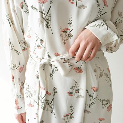 심플한 라운드 네크라인이 단정한 무드를 표현해주며 허리 라인부터 떨어지는 핀턱 디테일이 더해져 우아한 실루엣을 연출해줍니다. 흩날리는 플라워 패턴으로 잔잔한 느낌이 들며 롱한 기장감은 체형 커버에 도움을 줍니다. 트렌치코트나 가디건에 매치하여 데이트 룩을 완성해보시기 바랍니다.