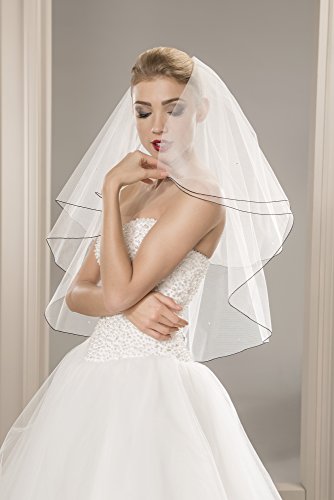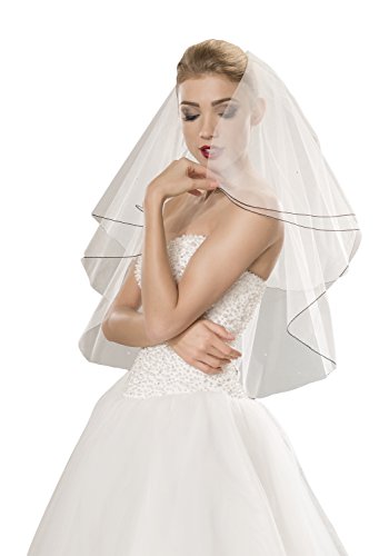 2-Tier Wedding Bridal Fingertip Veil With Black Edge Hand Decorated Of 40 Crystals