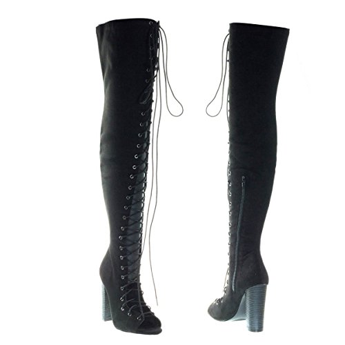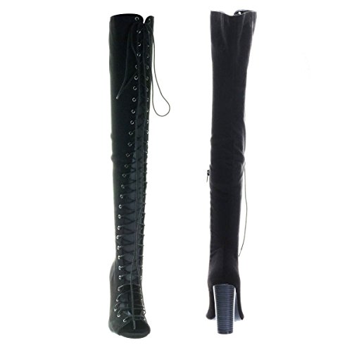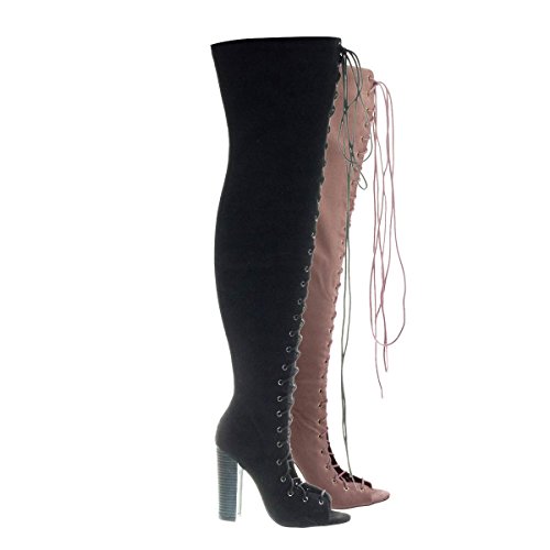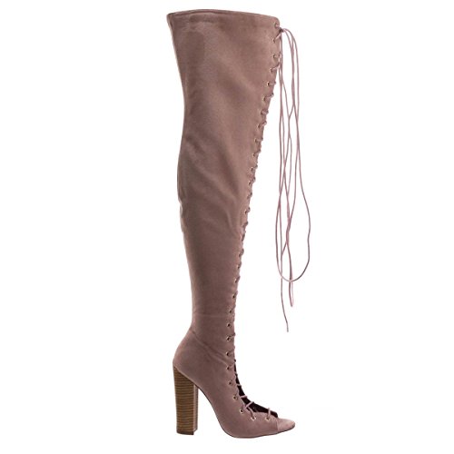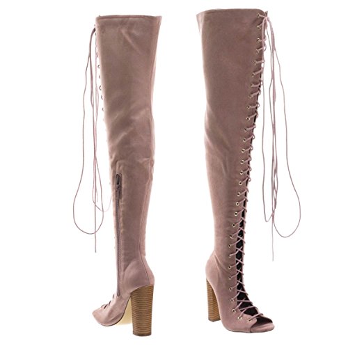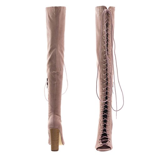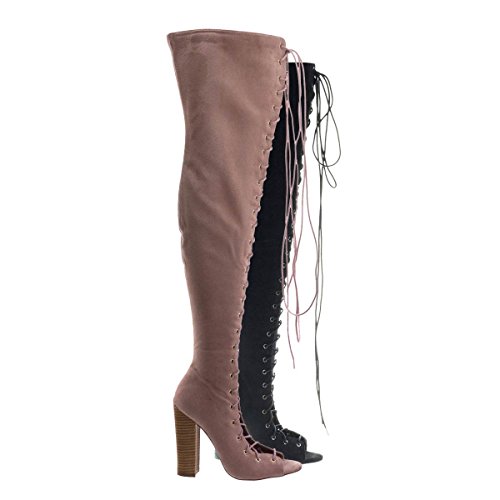 Binding : Apparel Product Description About This Shoes :These corset boots features a full frontal lace that reveals your legs, peekaboo toe, chunky block heel, faux stack heel, inner zipper closure and thigh high shaft. The shaft has a minimum circumference of 16 inches wide, it could fit lose if your thigh are thinner but the lacing closure allows it to fit most thigh width. Brand - Liliana Colors Available: Black, Mauve Pink Occasion: Party Shoe Type: Over Knee Boots Shoe Style: Over Knee Boots Inner Lining: synthetic Heel Height In Inches - 4.25 Heel Style - Block Toe Style - peep-toe Platform Height In Inches - 0.25 Shaft Height In Inches - 21.5 Circumference Opening - 16 Strap Type - strapless Sole - manmade All Man Made Material unless otherwise stated. Computer/Phone/Table monitors might show color differently because of its quality or calibration, we suggest you look at the photo in at least 3 monitors if you need exact color match of your shoes. 0