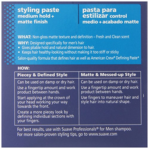 -. Binding : Health and Beauty -. Brand : Suave -. EAN : 0079400120731 -. Feature : Suave Professionals Men's Styling Paste gives pliable hold and natural dimension to your hair leaving you with a fresh and clean scent / Designed specifically for men's hair, Suave Professionals Styling Hair Paste for Men provides medium hold with a matte finish / Suave Professionals Men's Styling Paste keeps hair looking healthy without making it too stiff or sticky / Suave Styling Paste for Men is proven to define hair as well as a salon brand / Other products include Suave Professionals Men's Firm Hold Styling Gel -. IsAdultProduct : 0 -. Label : Suave -. Manufacturer : Suave -. Model : Sua-6685 -. MPN : Sua-6685 -. NumberOfItems : 4 -. PackageQuantity : 4 -. PartNumber : Sua-6685 -. ProductGroup : Beauty -. ProductTypeName : BEAUTY -. PublicationDate : 2010-11-19 -. Publisher : Suave -. ReleaseDate : 2011-01-30 -. Size : 1.75 Ounces -. Studio : Suave -. Title : Suave Professionals Men Styling Paste, Medium Hold + Matte Finish 1.75 Ounce (Pack of 4) -. UPC : 079400120731 Suave Professionals Men's Styling Paste gives pliable hold and natural dimension to your hair, keeping it healthy-looking without making it too stiff or sticky. Suave Professionals Men's Styling Hair Paste was designed for the specific needs of men's hair and is proven to define hair.