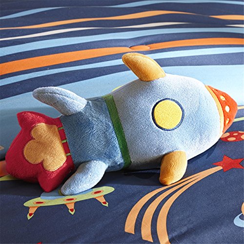 Blast into outer space with the space cadet comforter set! space ships and Rockets in fun shades of orange, green, Blue and red cover this Navy Blue comforter.