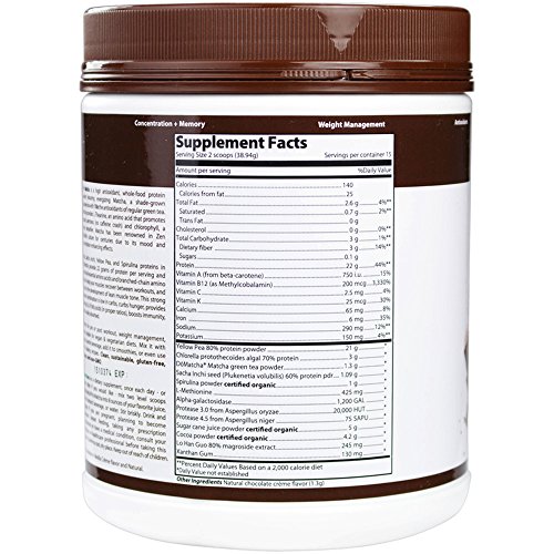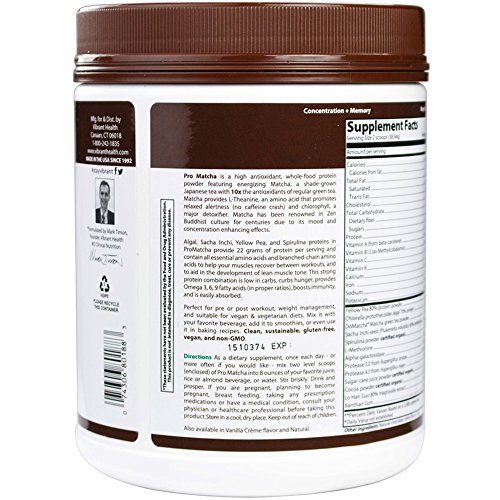 ReleaseDate : 2017-08-05 Studio : Inventory Management Services- HPC Publisher : Inventory Management Services- HPC Binding : Health and Beauty Product Description Pro Matcha is a whole food protein supplement featuring Matcha, a green tea which provides relaxed alertness as well as a strong antioxidant profile. Pro Matcha is detoxifying, energizing, curbs hunger cravings, and can be used a pre or post workout protein shake. Vegan, gluten free, non-GMO, and sustainable. Available in chocolate, vanilla, or natural. Matcha--Pro Matcha contains the world's finest and most renowned DoMatcha brand matcha tea. The whole tea leaf is consumed providing an arsenal of nutrients, vitamins, minerals, antioxidants, and amino acids - making it one of the healthiest beverages on Earth. Matcha is unique in that it provides L-Theanine, an amino acid that promotes a relaxed yet productive alertness and mood enhancement. L-Theanine works synergistically with the caffeine in Matcha to provide clarity and concentration without the jitters. Matcha provides sustained energy for up to 4 hours without the crash you may feel with coffee. It also has 6 times more amino acids than common black and green teas and is loaded with chlorophyll, a major detoxifier. Protein--Algal, Sacha Inchi, Yellow Pea, and Spirulina provide 21 grams of protein. This strong protein combination curbs hunger, provides Omega 3,6,9 fatty acids (in proper ratios), detoxifies, is low in carbs, boosts immunity, and is easily absorbed. Pro Matcha protein contains all essential amino acids and branched-chain amino acids (BCAAs). Amino acids, the building blocks of proteins, have various functions related to energy production. There are 9 essential (must get from our diets) amino acids and 12 non-essential (produced by the body) amino acids. BCAAs have been used to prevent fatigue, improve concentration, and to avoid or lessen sore muscles after exercise. BCAAs are believed to decrease serotonin levels, thus cancelling out the fatigue from exercise and enhancing exercise performance. BCAAs have also been shown to help with muscle synthesis and prevent muscle loss. 0