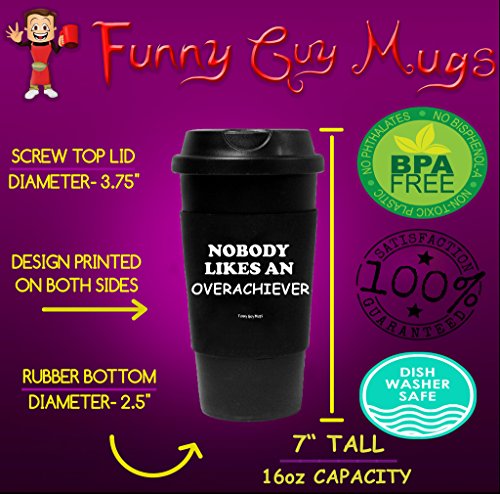 CONTENTS: * 1 BPA Free Plastic Travel Tumbler. 1 Silicone Sleeve * Contents Come New In A Color Gift Box. MATERIAL: * Rubber Bottom * Plastic Screw Top Lid * Double Wall Plastic Body * Double Wall Plastic Body * Silicone Removable Sleeve. Features: * Silicone Sleeve= Reusable, Removable, Eco-Friendly, Dishwasher Safe & Printed On Both Sides * Plastic Tumbler= Double Wall Body, BPA Free Plastic, Rubber Bottom, Screw Top Lid & Machine Washable. SIZING: * Sleeve= Approx 3.5" Tall- 3.5" Diameter * Tumbler= Approx 7" Tall- 2.5" Diameter Base- 3.5" Top Fits In Most Cup Holders. Perfect For The Car, SUV, Van Or Truck. Comfortable Grip That Provides Convenient One-Handed Drinking For Both Left and Right Handed Users. Ideal For Coffee, Tea And Hot Cocoa. Perfect For In The Office Or On The Go. ABOUT FUNNY GUY MUGS: This Tumbler & Sleeve Were Created Exclusively By Funny Guy Mugs. Funny Guy Mugs Is A Trusted Company Ran & Founded By Brothers Whose Mission Is To Create High Quality Products That Put A Smile On Your Face!Feature