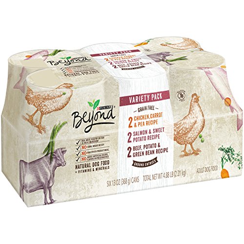 Offer your dog a variety of grain-free mealtime options with this Purina Beyond Grain Free Ground Entrees adult wet dog food variety pack. Each recipe in this pack features real beef, chicken or salmon as the #1 ingredient, so you can rest easy knowing he's getting wholesome meals made with high-quality ingredients you know and trust. With real, recognizable ingredients plus essential vitamins and minerals in every serving, this wet dog food gives him the nutrition he deserves in grain- and gluten-free recipes you want for your canine companion. With three different recipes in every package, this premium dog food collection makes it easy for you to mix things up at mealtime while still tending to his nutritional needs. Give your faithful friend a natural meal you can trust with every delicious selection in this Purina Beyond wet dog food variety pack. Your dog's sure to love the variety, just as you'll love the quality and convenience of ordering from Amazon.com.Feature