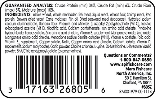 Studio : Mars Fishcare Inc. Publisher : Mars Fishcare Inc. Binding : Misc. Product Description API has developed a fish food diet that delivers a healthier aquatic environment for fish and clean, clear water. API Fish Food contains a unique, nutritionally enhanced protein to ensure easy uptake of nutrients, for maximum absorption. Fish more readily use the nutrients and release less waste and less ammonia, for clean, clear water. Laboratory testing has proven that API Fish Food delivers up to 30% less ammonia than the leading competitor. API Fish Food, The Clear Choice in Fish Nutrition. 0