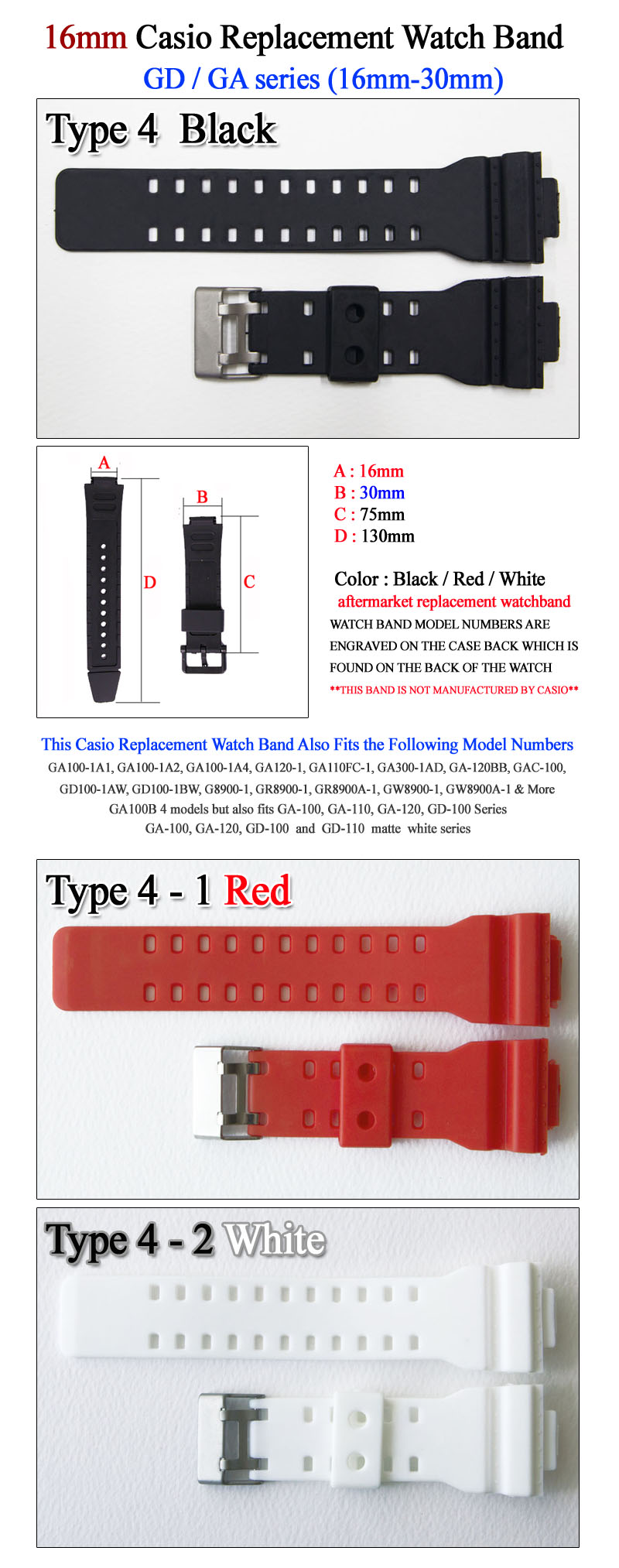 Item up for sale is a new released custom manufactured replacement watchband for Casio G Shock watch available in 3 matte colors: Black, Red & White.