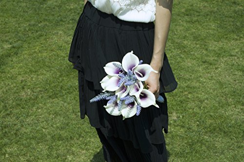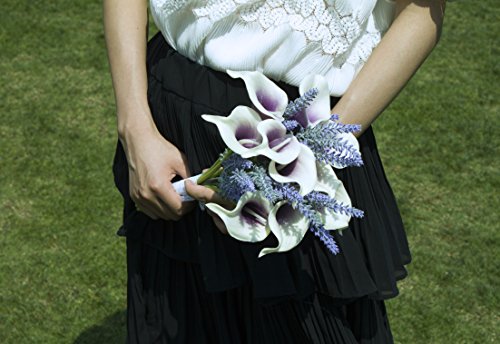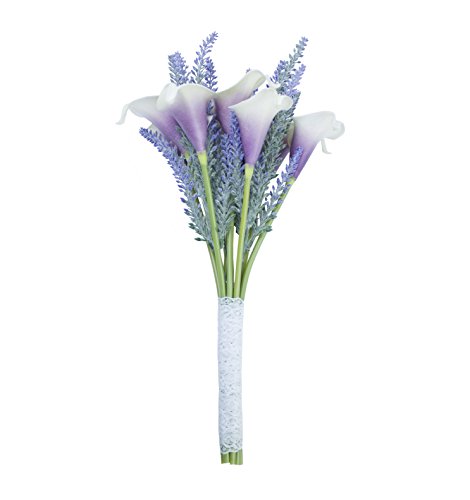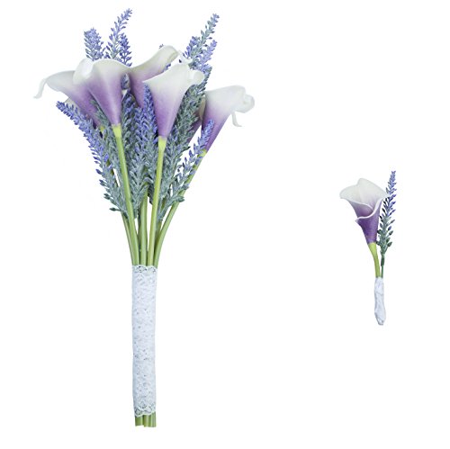 - Package: 1 bouquet flower( include 1 bunch of 5 heads purple lanvender,10 heads of white and purple callas ),measured approximately 40.5*22.5cm,and 1 corsage(a white and purple calla and a lavender) measured approximately 17.5*6.5cm