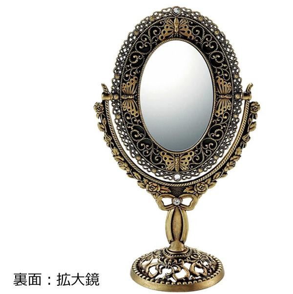 細かい模様使いで全体をデコラティブに仕上げたオーバルタイプのスタンドミラー。持ち運びに便利な安定感あるスタンドデザインは、心地良い使用感を生みます。表裏両面使えるリバーシブル仕様で、一方は拡大鏡になっています。ミラーを好みの角度に変えれて、使い勝手抜群!! |