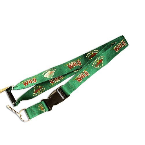 -. Feature : Minnesota Wild logo. Materials: Metal detachable clip, nylon, plastic. / Green with Minnesota Wild logo on each side. / Extra thick band with raised lettering. / No velcro or safety clip. / Dimensions: 23 inches long x 1 inch wide.