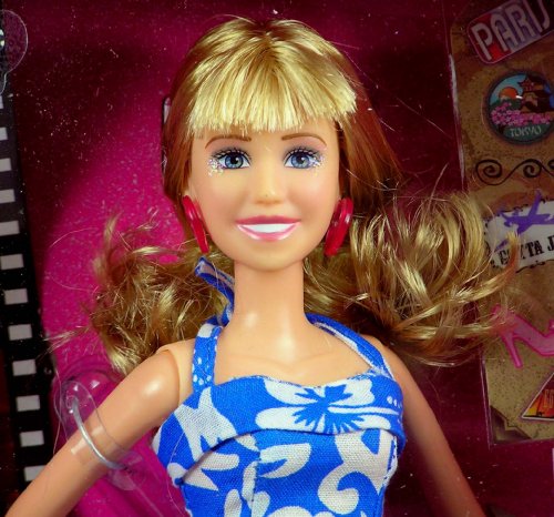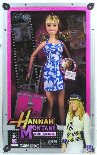 Hannah is on the move This doll features the pop star in a blue Hawaiian print dress and toting her pink travel trunk. She's a great gift for fans of the show and movie