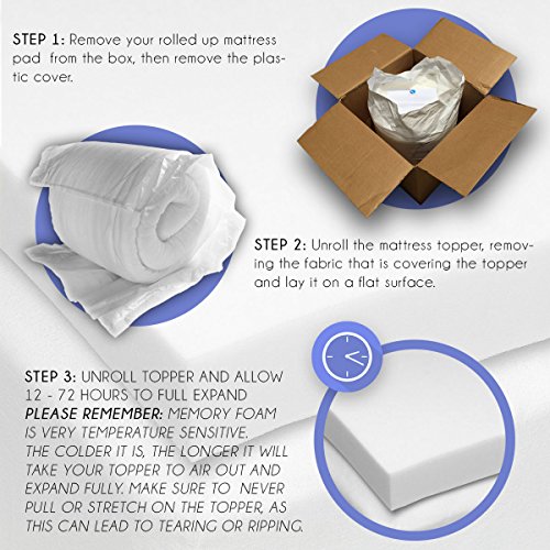 -. Feature : ENHANCED COMFORT. Experience superior sleep comfort on our innovative 2" Visco Elastic Memory Foam Mattress topper. Relieve pressure points, relax muscles, help spinal alignment and enjoy minimized motion transfer (for those of you with restless sleeping partners, pets and/or kids). / STAY COOL. Our open cell structure design expands with pressure to increase air flow offering the perfect mixture of a cozy, yet cool sleep experience. / ODORLESS. It's a complicated process but our toppers neither have an off putting smell upon arrival, nor do they absorb smells put off by moisture and sweat. Our open cell system and increased air flow design minimizes heat accumulation. / CERTIFIED FOAM - Our memory foam is produced in accordance with CertiPUR-US® Each topper is made without Ozone Depleting agents, formaldehydes, PBDE, TDCPP, or TCEP flame retardants, mercury, lead or heavy metals or phthalates prohibited by the CPSC. We also use low VOC emissions for indoor air quality (less than 0.5 parts per million). Our memory foam mattress toper is ecofriendly so you can sleep well knowing our products have a low environmental impact. / WARRANTY AND MONEY BACK GUARANTEE. We stand by the quality of our luxurious products. 60 Day Money Back Satisfaction Guarantee and a 3 Year Manufacturers Warranty. Our customer service representatives happily take care of all of our customer's needs.
