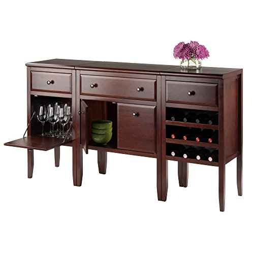 -. Feature : 3-part modular buffet / Crafted of solid and engineered wood / Rich cappuccino finish / 3 storage drawers / 12-bottle wine storage area