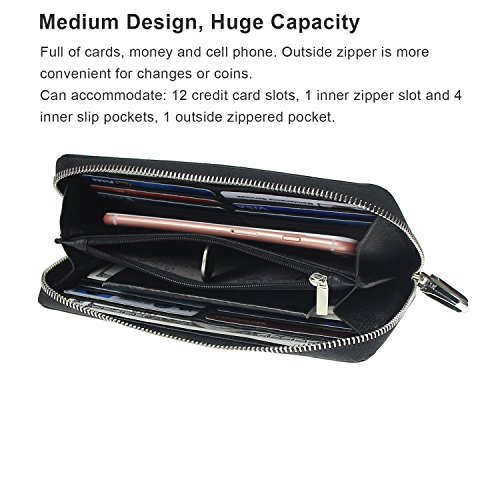- ★ LARGE WOMENS WALLET - This wallet features great storage capacity and usability. Large capacity wallet, top single zipper closure for: 12 credit card slots, 1 inner zipper slot and 4 inner slip pockets offer great variety of storage, 1 ID window with central cut out over, 1 outside zipper pocket for changes and coins.