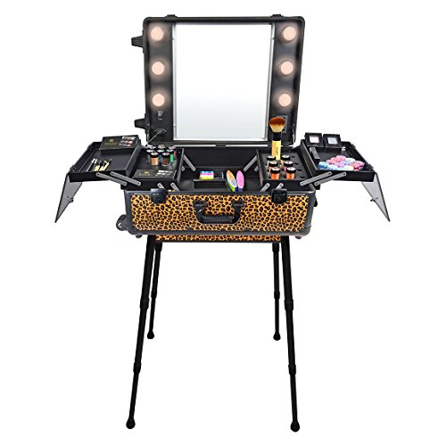 [Description] Luxurious and heavy-duty studio-to-go makeup trolley is best in class. Stands 2`` to 5`` high. Includes 6 x 40 Watt dimmable lights and an extra electric outlet for beauty tools. Used in fashion runway shows as temporary makeup station and beauty travel luggage. It has expandable legs_ safety locks_ multiple trays_ and a clear window. Case measures 24.8`` x 17.7`` x 8.6`` when closed