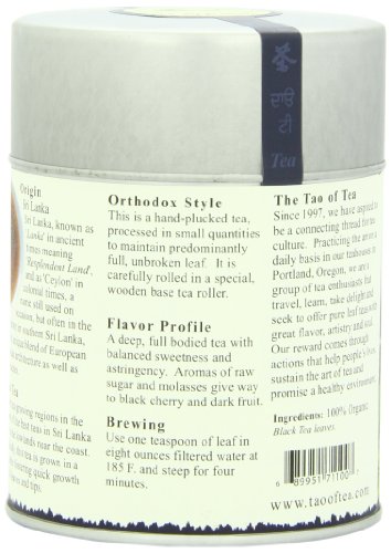 -. Binding : Grocery -. Brand : The Tao of Tea -. EAN : 0689951711007 -. Feature : Pack of two, 4-Ounce (total of 8-Ounces) / Ceylon black tea / USDA Organic -. Label : The Tao of Tea -. Manufacturer : The Tao of Tea -. NumberOfItems : 2 -. PackageQuantity : 2 -. ProductGroup : Grocery -. ProductTypeName : GROCERY -. Publisher : The Tao of Tea -. Size : 4 Ounces -. Studio : The Tao of Tea -. Title : The Tao of Tea, Black Tips Black Tea, Loose Leaf, 4-Ounce Tins (Pack of 2) -. UPC : 689951711007