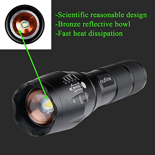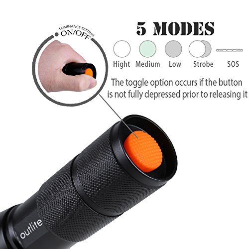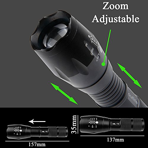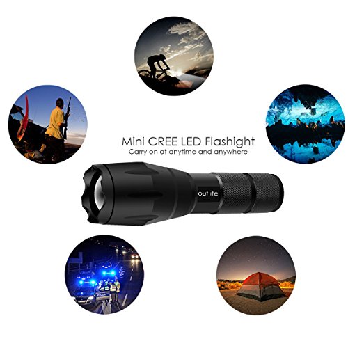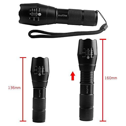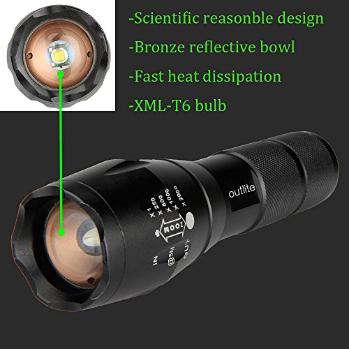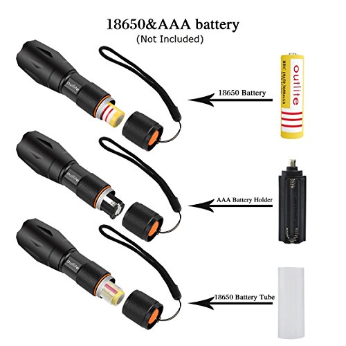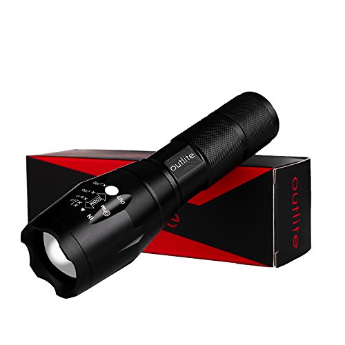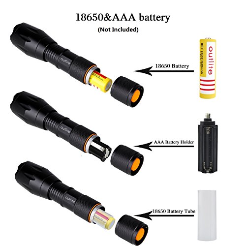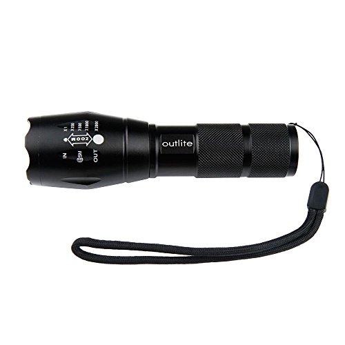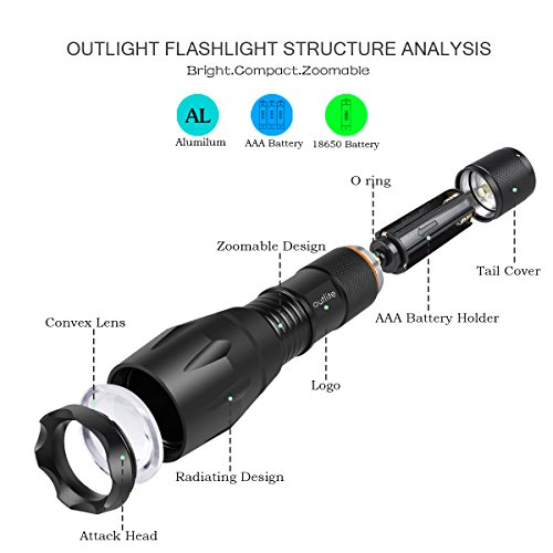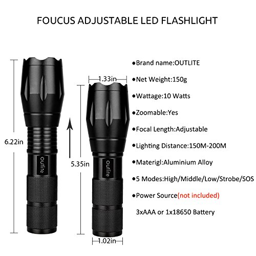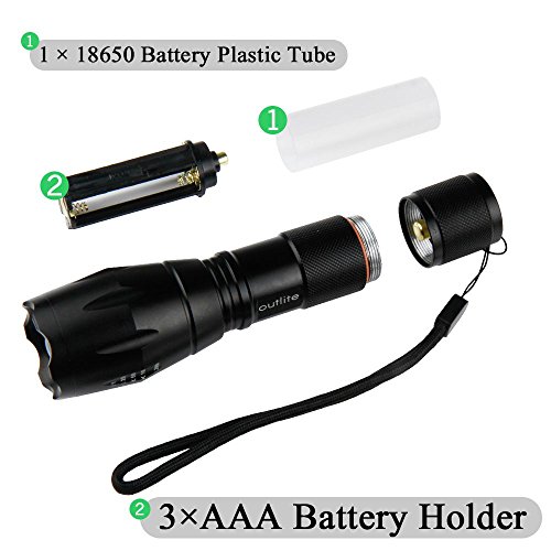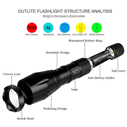 Studio : outlite Publisher : outlite Binding : Misc. Product Description ?Specification 1) Type of LED : CREE XM-L T6 LED 2) Adjustable Focus: can adjust its focus for different usage 3) Output brightness: Can come to above 900 lumens [lm] (when using 18650) 4) Internal wiring applies the high efficient booster circuit, working voltage is wide and can utilize the batteries in the largest extent 5) Waterproofing design(But Can't put it into water directly) 6) 5 switch Modes: high / middle / low / strobe / sos 7) Made of high quality 6061T aluminum alloy, this flashlight is sturdy and durable enough for long time daily using 8) Lamp base: CREE, high power LED. With a lifespan of up to 100,000 hours or more, no need to consider replacing the cap for the whole life 9) Power by: 1x 18650 3.6v/3.7v OR 3X AAA battery(Battery not included) ?Package: 1x CREE XM-L T6 LED Flashlight 1x Plastic tube for using 18650 battery 1x AAA battery holder for using AAA battery if you need batteries that are compatible with this item, please refer to the link below: 1)http://www.amazon.com/gp/product/B00S4OGOWM 2)http://www.amazon.com/gp/product/B00XMUAGOK if you need a flashlight includes battery and charger, please refer to the link below: http://www.amazon.com/gp/product/B00VZT2WP6 0
