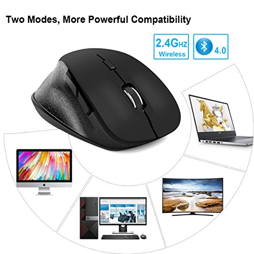 -. Feature : [❄Dual Mode Connection❄]:This creatively and conveniently designed mouse,can work on two devices, connecting one device through Bluetooth and the other via RF 2.4Ghz. You could intelligently switch the mode between both devices just by a click. / [❄Ergonomic and Silent Click Design❄]:It is a user-friendly design,perfect for all hands,fits comfortably in your hand and the buttons are perfectly located for your office and gaming needs, without annoying click sounds and avoids hand fatigue for long term use. / [❄Portable and Pocket Size❄]:Slim and light weight design make it perfectly for travel, easy to put in your laptop bag or pockets. Meanwhile, you can operate on two computers only with one mouse. / [❄Wide Compatibility❄]:Bluetooth mode works with Windows/ Android/ MAC OS system. No code required and intelligent connectivity. 2.4G mode works for laptop, desktop, smart TV and any device with USB port. / [❄12-month Warranty❄]:100% risk-free satisfaction guarantee to let you buy with confidence. Kind note Bluetooth works only with 4.0 and above version.