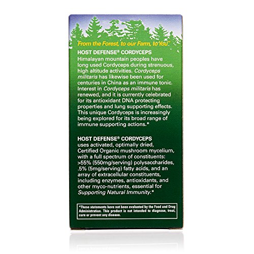 Himalayan mountain peoples have long used Cordyceps during strenuous, high altitude activities. Recently, professional athletes and fitness enthusiasts have discovered that Cordyceps may support increased oxygen uptake and higher endurance levels. People have also found that Cordyceps supports healthy sexual functioning. Host Defense® Cordyceps uses activated, freeze-dried, Certified Organic mycelium, with a full spectrum of constituents: polysaccharides (beta glucans, arabinoxylane, glucose, xylose, galactose and cordycepic acid), glycoproteins, ergosterols, triterpenoids and other myco-nutrients, which are essential for Supporting Natural Immunity.Feature