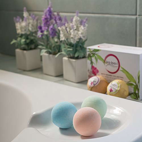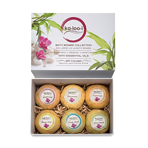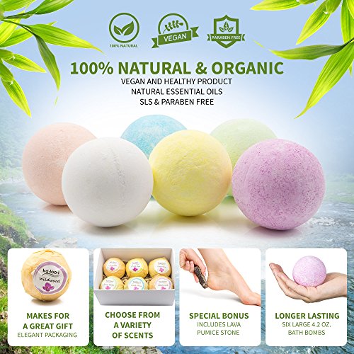 Made with natural, vegan ingredients, your Kalooi organic bath bombs gently soothe away stress. Gift box provides 6 scented bath balls, each 4.2 oz., plus bonus pumice stone.