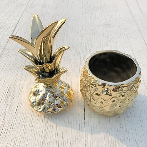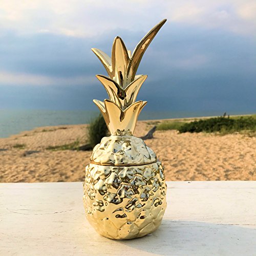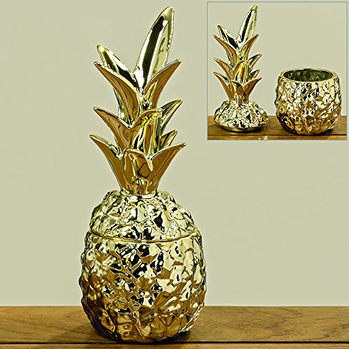 - WELCOME HOME This iconic pineapple jar with lid is ready to add a decorative focal point where ever it is placed. Inspired by the spiky tops and quilt like belly of real pineapples, this well proportioned storage jar is made of mold poured ceramic and finished with brilliant gold glaze.