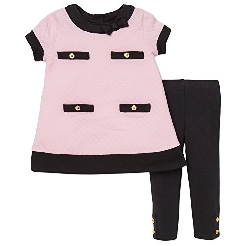 -. Binding : Apparel -. Brand : Little Me -. Color : Pink -. Department : baby-girls -. Feature : Each set includes 1 girls short sleeve dress and 1 pair of black leggings / Pink dress has a slight quilted pattern in the fabric and black trim. Black trim has gold buttons to accent the look. / Black pants have an elastic waistband and fitted ankles for a slim look / Dress buttons in back for easy on and off / Superior details and soft fabrics makes this outfit a fantastic value. You can dress it up for a special occasion or wear it for every day for a cute casual look -. ProductGroup : Apparel -. ProductTypeName : SLEEPWEAR -. Title : Little Me Toddler Girls Pink Short Sleeve Dress and Leggings Set