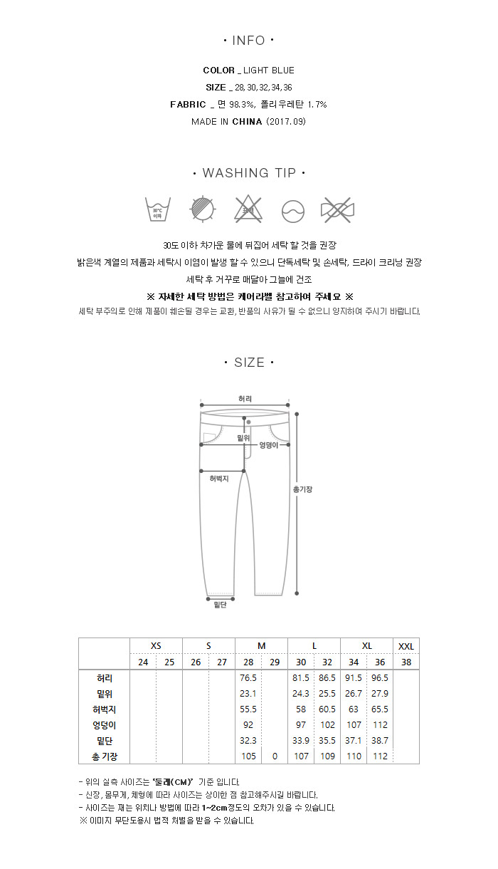 | 되도록 드라이 크리닝 하십시오. 손세탁시 뒤집어 단독세탁 하십시오. 착장시 가방류나 밝은 색상의 의류에 이염 될 수 있으니 주의 하십시오. 반드시 단독 손세탁 또는 드라이 하십시오. 세탁시 탈색의 우려가 있으므로 단독 세탁하십시오. 품질 경영 촉진법에 의한 품질 표시를 꼭 참조하시어 세탁하십시오. 합성세제 세탁시 손상 및 탈색의 우려가 있으므로 미지근한 물에 중성세제로 세탁하십시오. 절대 염소계 표백제로 표백할 수 없습니다. 땀에 젖었을 경우 즉시 세탁하십시오. 심하게 비비거나 비틀어 짜지 마십시오. 물에 10분이상 담가두지 마십시오. 취급부주의로 인한 탈색 및 오염 등 제품의 형태 변질 및 수축된 제품은 보상이 불가능 하오니 주의 하십시요. 취급표시대로 세탁하지 않을시에는 보상받으실수 없습니다. |