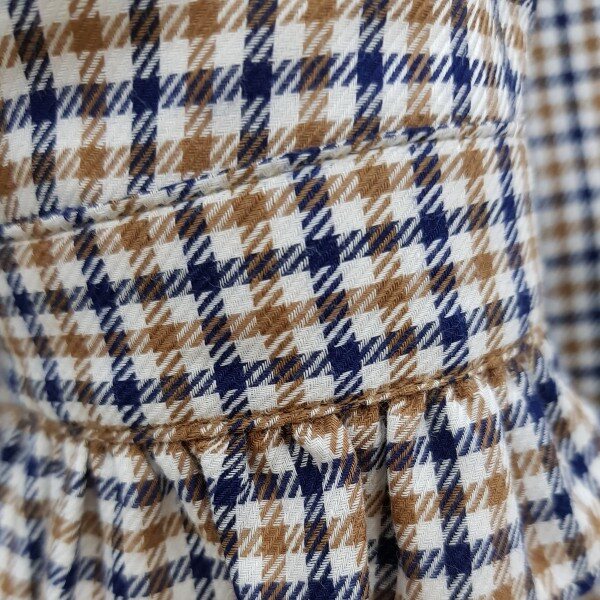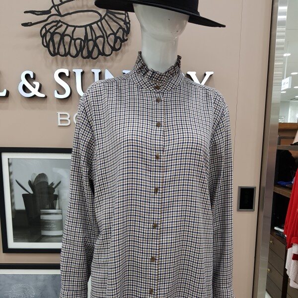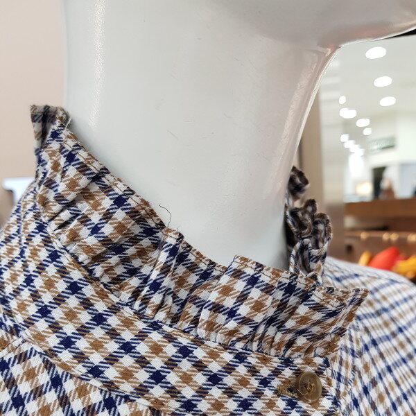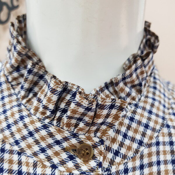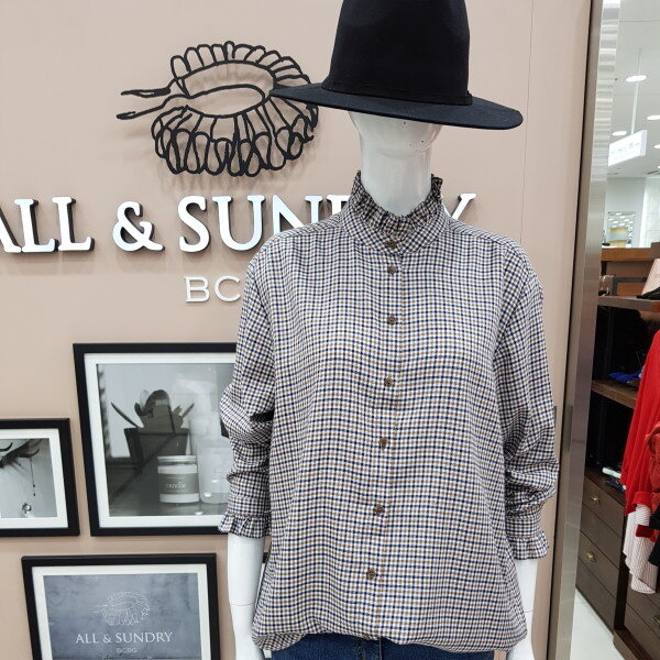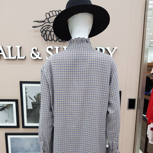 면섬유와 모섬유의 배합으로 만들어진 아주 부드러운 소재의 가을 낌이 나는체크 브라우스 입니다. 모섬유가 적당히 섞여있어 초가을 날씨에입기 좋습니다. 목선과 손목부분에 프릴이여성스러움을 포인트로 줍니다.