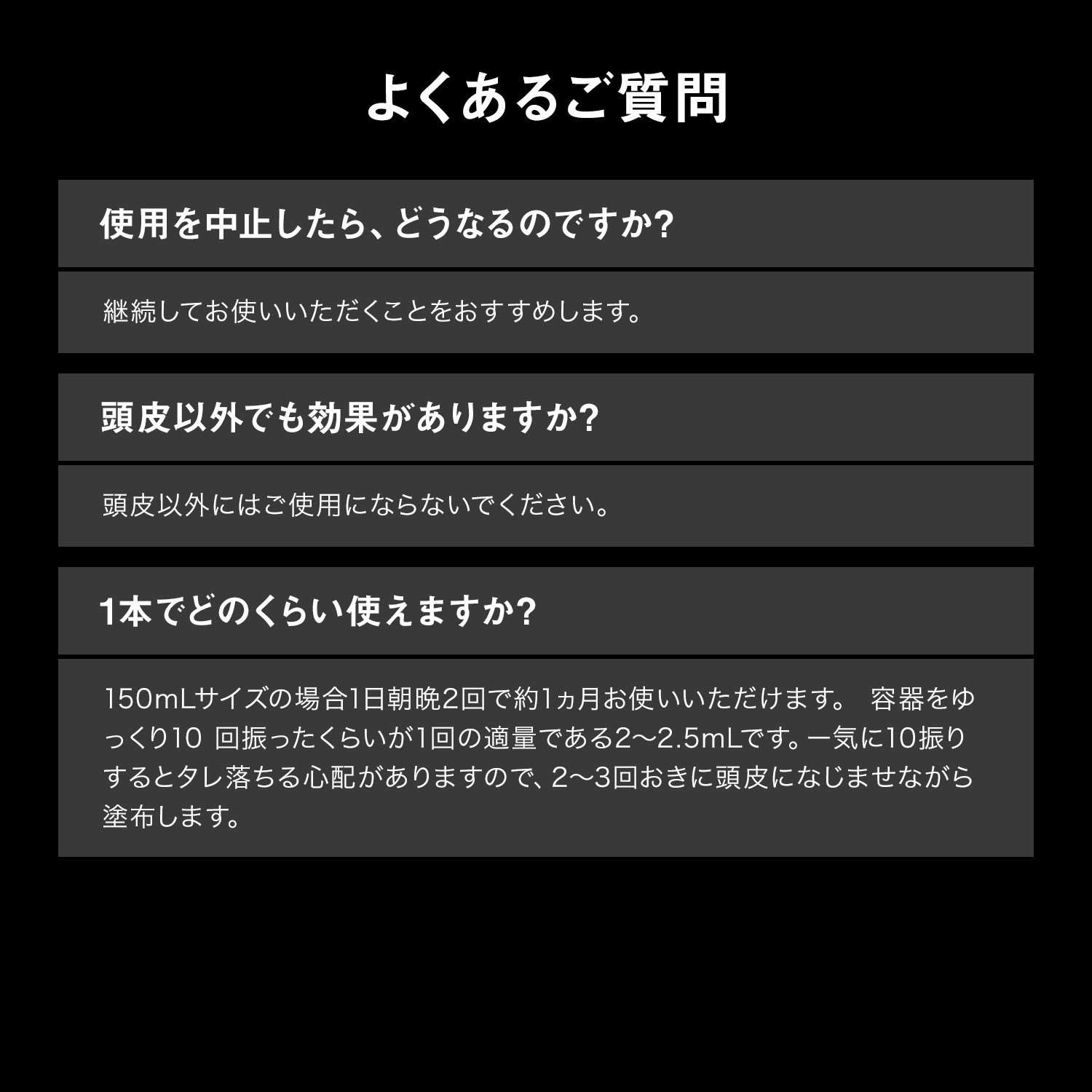 頭皮に傷やはれもの・湿しん・色抜け(白斑等)や黒ずみなどの異常が生じていないかよく注意して使用してください。頭皮に合わないときは、使用を中止し、皮ふ科医などにご相談ください。 目に入らないようにご注意ください。もし入った場合はすぐに水かぬるま湯で洗い流してください。 ご使用後はキャップをきちんとしめてください。 髪を染めていると色落ちすることがあります。 樹脂製のクシやメガネにつくと変色することがありますので、きれいにふきとってください。 乳幼児の手の届かないところにおいてください。 火気にご注意ください。
