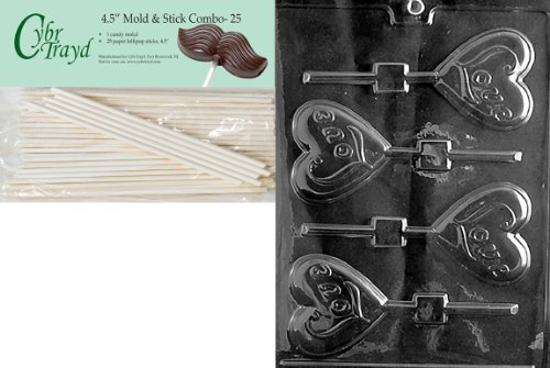 Cybrtrayd 45St25-V049 Love Heart Lolly Valentine Chocolate Candy Mold with 25 4.5-Inch Lollipop Sticks