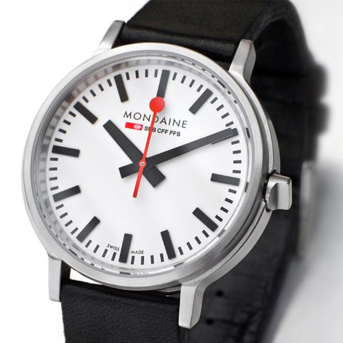 -. Feature : Mondaine Stop2go leather strap watch / Black hour markers, Black hour and minute hands / Swiss-quartz Movement / Case Diameter: 41mm / Water Resistant To 99 Feet
