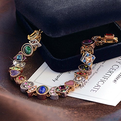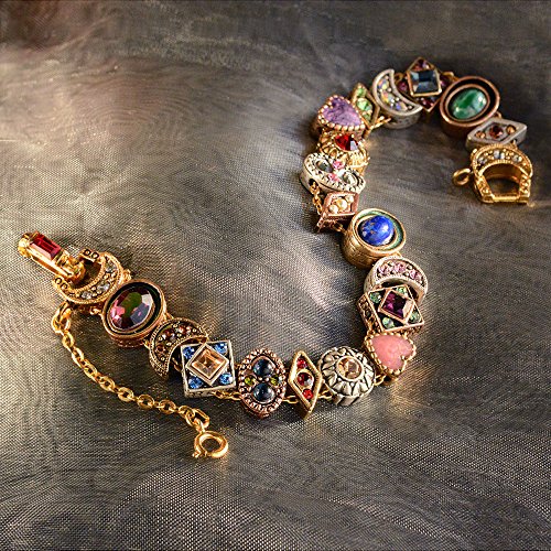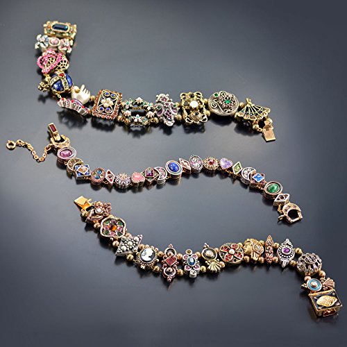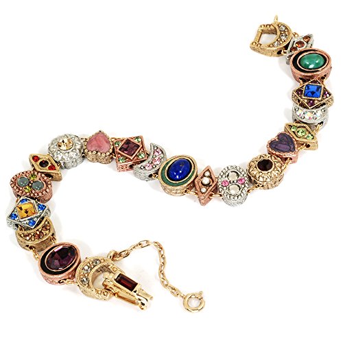 During the Victorian era, slide bracelets were made from old keepsake jewelry parts, stickpin heads, rings, small pins and buttons. They became known as "slide" bracelets because of the movement of their elements on a chain. Ours is a dainty sequence of Victorian era ovals, diamonds, hearts and squares enameled and set with colored crystal and vintage stones. Conveying the keepsake melange of the originals, it is finished in 14K gold, silver and bronze.