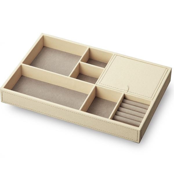 小物入れの数が多いので、指輪等アクセサリーからスマートフォンまで様々な物を収納する事ができる、フェイクレザーのトレーです。