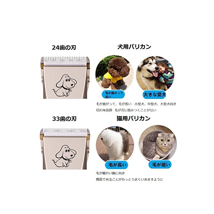 2,24이/33이:간단한 조작으로 초심자에게도 사용하기 쉽다.정밀한 24치아의인은 견용바리 캔으로서 최적입니다.33치아의인은 토이 푸들이나 길이 모고양이에게 가장 적용에,묘용바리 캔으로서 최적입니다.양자도 부드러운 트리밍 이 생기고, 집에서 애견 애고양이의 전신 컷이나 부분 컷을 악얼룩고 있습니다.