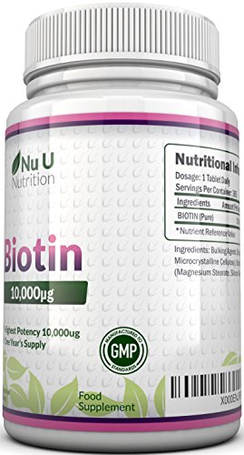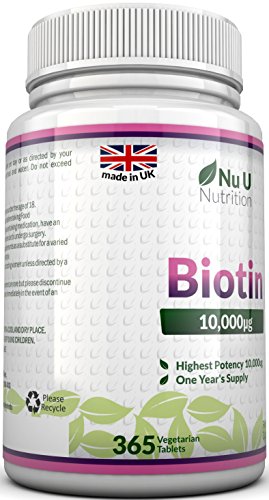 Nu U Biotin mit maximaler Stärkerezeptur Wir bieten immer marktführende Rezepturen an. Unser Biotin beinhaltet 10,000 mcg und ist doppelt so stark, wie die meisten Produkte unserer Mitbewerber. Damit ist es noch nicht genug. Wir bieten Ihnen ebenfalls ein verblüffendes Preis-, Leistungsverhältnis, mit einer VOLLEN Jahresversorgung - 365 Tabletten! Vergessen Sie nicht unsere ohne Fragen zu stellen Geld zurück Garantie. Das Risiko tragen wir! Warum sollten Sie das Biotin von Nu U Supplements, auswählen? * 100%-ige GELD-ZURÜCK-GARANTIE- Ohne Fragen zu stellen, fühlen Sie sich besser, oder Geld zurück. * HOCHENTWICKELTE REZPTUR- Unser Biotion beinhaltet volle 10,000mcg pro Tablette, doppelt so stark, als die Produkte von vielen Mitanbietern. * LEICHT ZU SCHLUCKEN - Unsere Biotintabletten sind kompakt und so konzipiert, damit sie leicht zu schlucken sind. * VOLLE 12 MONATSVERSORGUNG - Ein erstaunliches Preis-, Leistungsverhältnis, ohne Notwendigkeit für ein ganzes JAHR neu bestellen zu müssen! * VEGETARIER FREUNDLICH & OHNE SCHADSTOFFE- Geeignet für Vegetarier & frei von künstlichen Farbstoffen, Aromen, Süssungsmittel, Stârke, Milch, Laktose, Soja, Gluten, Weizen und Hefe. * IN GROSSBRITANNIEN PRODUZIERT- In Grossbritannien, gemäss den weltweit höchsten Qualitätsstandards, hergestellt.Feature