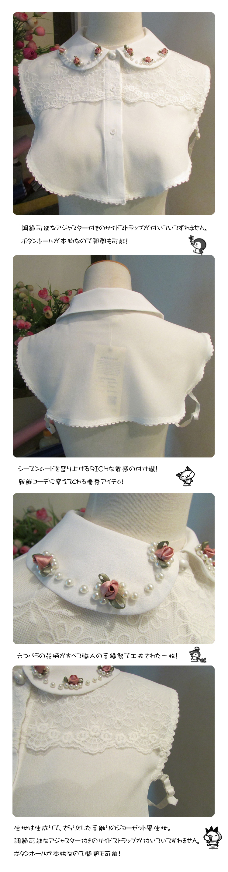 | 襟の淵にば薔薇とパールがあしらわれたシャツつけ襟。バラの花柄がすべて職人の手縫製で工夫された一枚!シーズンムードを盛り上げるRICHな質感の付け襟!新鮮コーデに変えてくれる優秀アイテム!生地は生成りで、ざらりとした手触りのジョーゼット風生地。調節可能なアジャスター付きのサイドストラップが付いていてずれません。ボタンホールが本物なので開閉も可能!ロンTやニット、ワンピースなどに合わせるだけでレイヤードスタイルが完成!シャツ部分を広めに作ってあるので、深く開いたVネック等にも◎着ぶくれしないのが嬉しいアイテムです。アクセサリー感覚で取り外しことも出来る。オシャレ感とトレンドを存分に演出してくれる旬なマストアイテムです??瑰手工?制六つバラの花柄がすべて職人の手縫製で工夫された一枚! | |