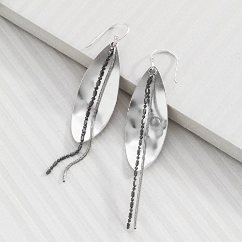 These Festival Earrings feature leaf-shaped sterling silver plates behind darker strands of beaded and coiled sterling silver