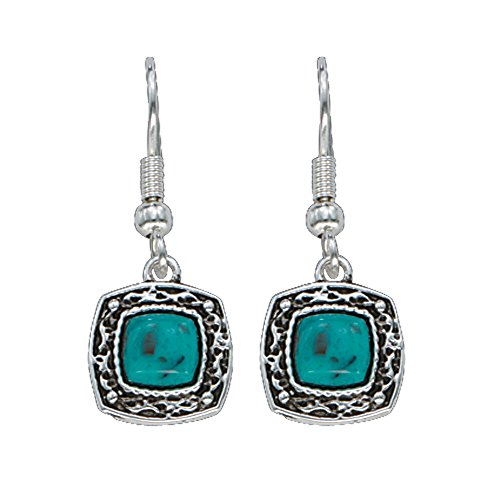Small square pillow cut turquoise stones are set in antiqued silver and filigree frames dropping just a little down from frnech hooks for a little dangle, a little flash and flair.