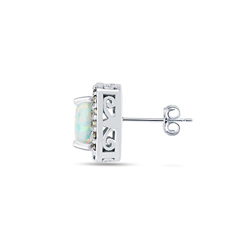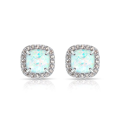 Enhance your look with these precious stud earrings. Sparkling cushion-cut white opal gemstones are set on a polished sterling silver frame surrounded by dazzling round gemstones creating a halo affect. It secures to the ear with post with friction backs.