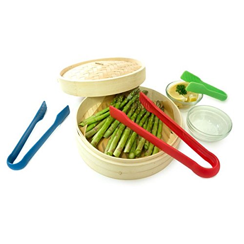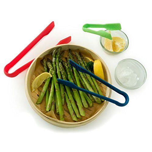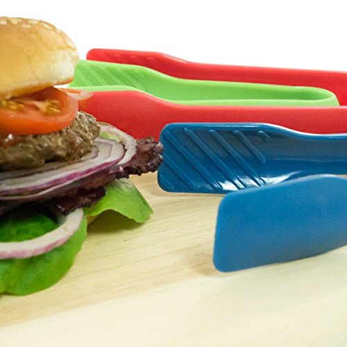 Product Description Perfect for serving meats, building burgers, salad bars, hors d`oeuvres, vegetables, waffles, pancakes, bread baskets and as toaster tongs. Nesting tongs snap together for easy storage. Grooved tong heads grip food easily. Heavy duty polypropylene. Heat resistant up to 400 degrees F. Dishwasher safe. Set of 3 includes one Red: 10 x 4 x 1 inches, Blue: 8 x 3 x 1inches , Green: 6 x 1.75 x 1 inches. 0